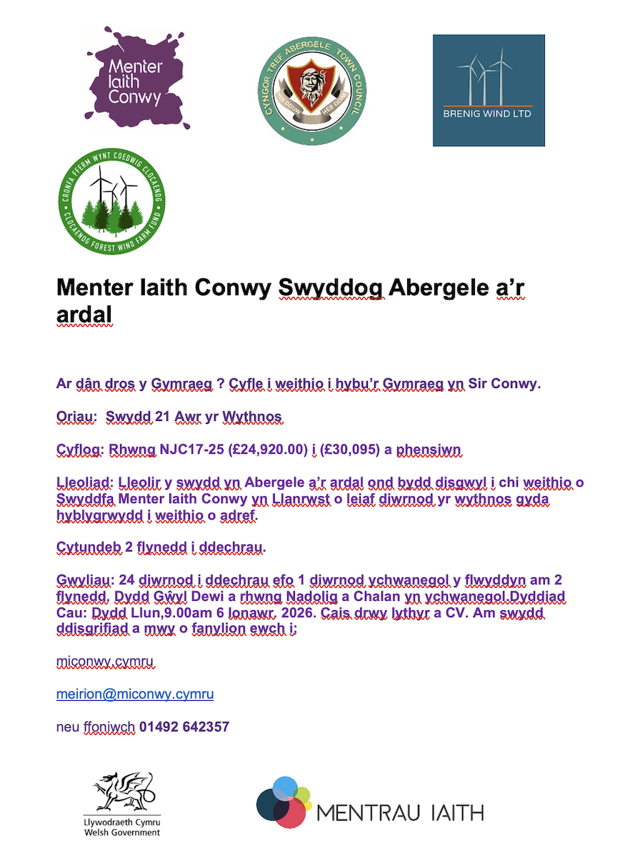 4.2 Lleoliad: Lleolir y swydd yn Abergele a’r ardal ond bydd disgwyl i chi weithio o Swyddfa Menter Iaith Conwy yn Llanrwst o leiaf diwrnod yr wythnos gyda hyblygrwydd i weithio o adref.