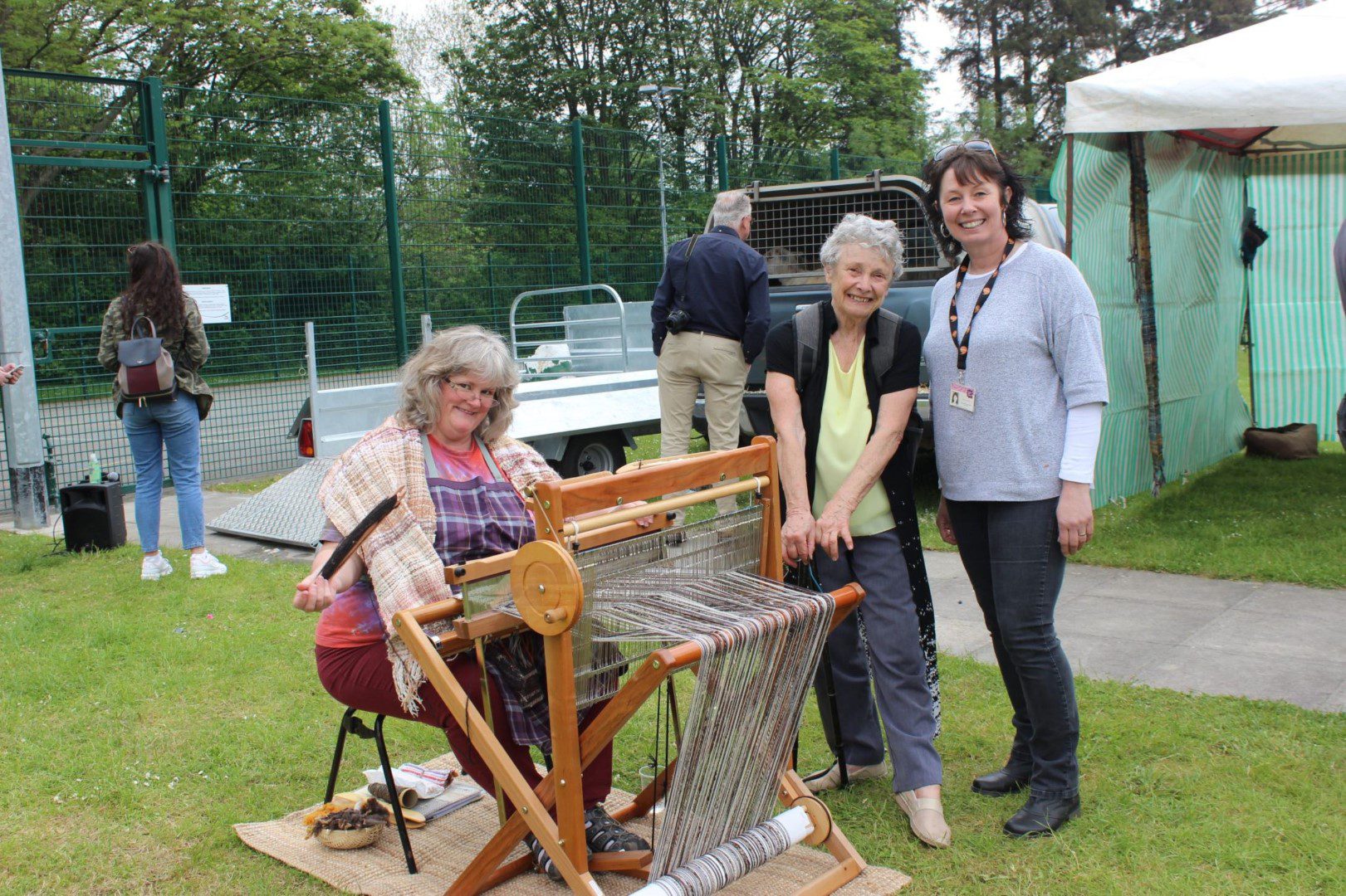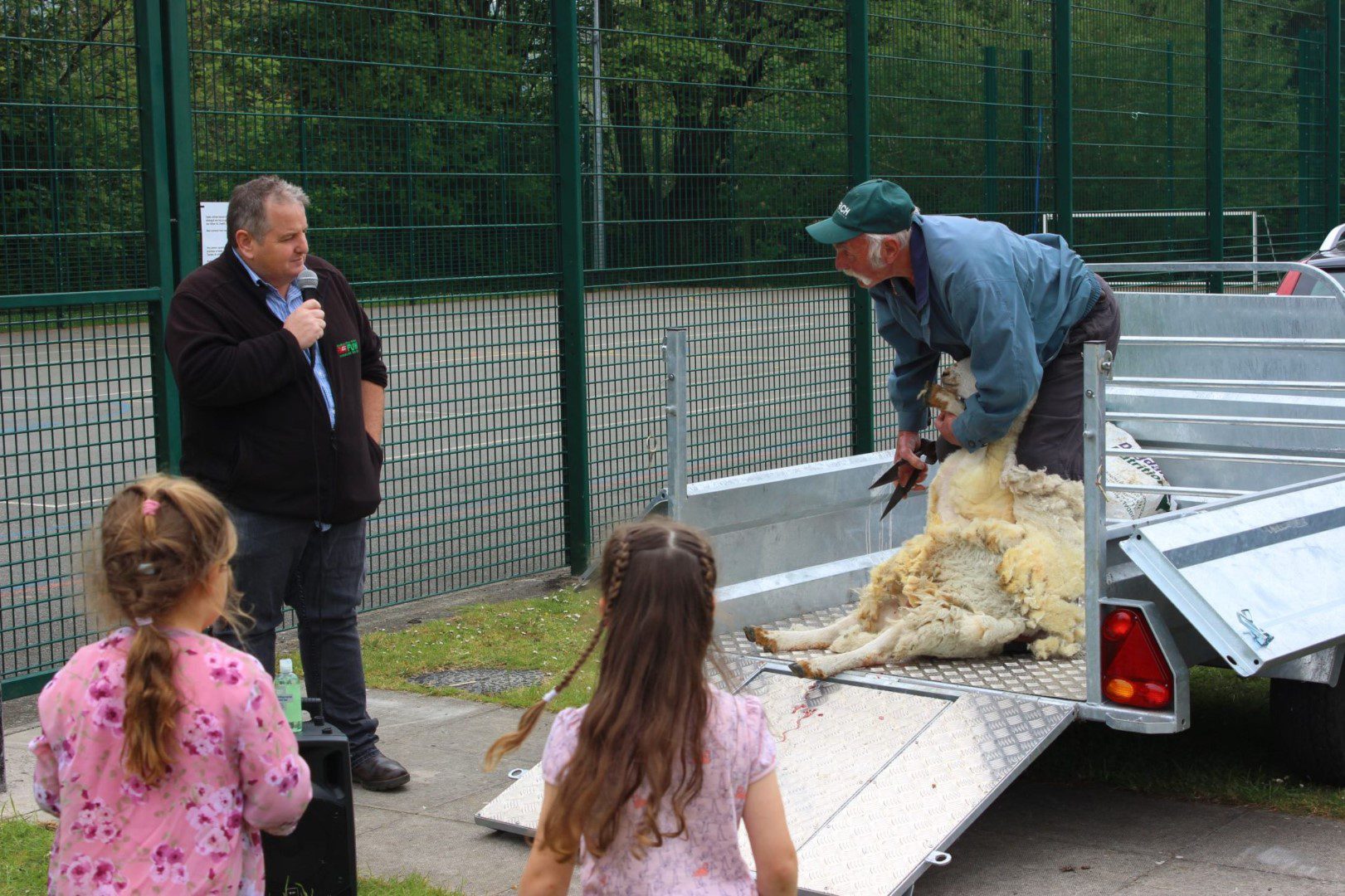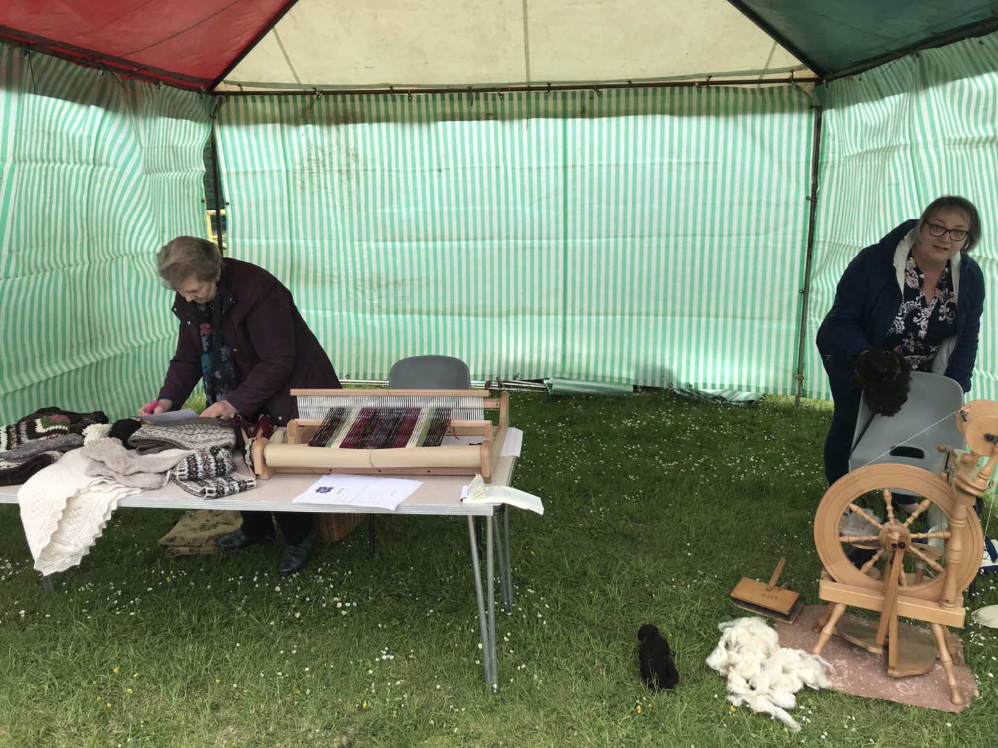 Gwynros Jones came to show how to shear a sheep with a blade, with Dafydd Jones (FUW) commentating, and explaining how they handle the wool afterwards. Julia and Edith Davies brought their weaving tools and Eifiona Davies showed us how she spins the wool. This was a new experience for a lot of the audience.