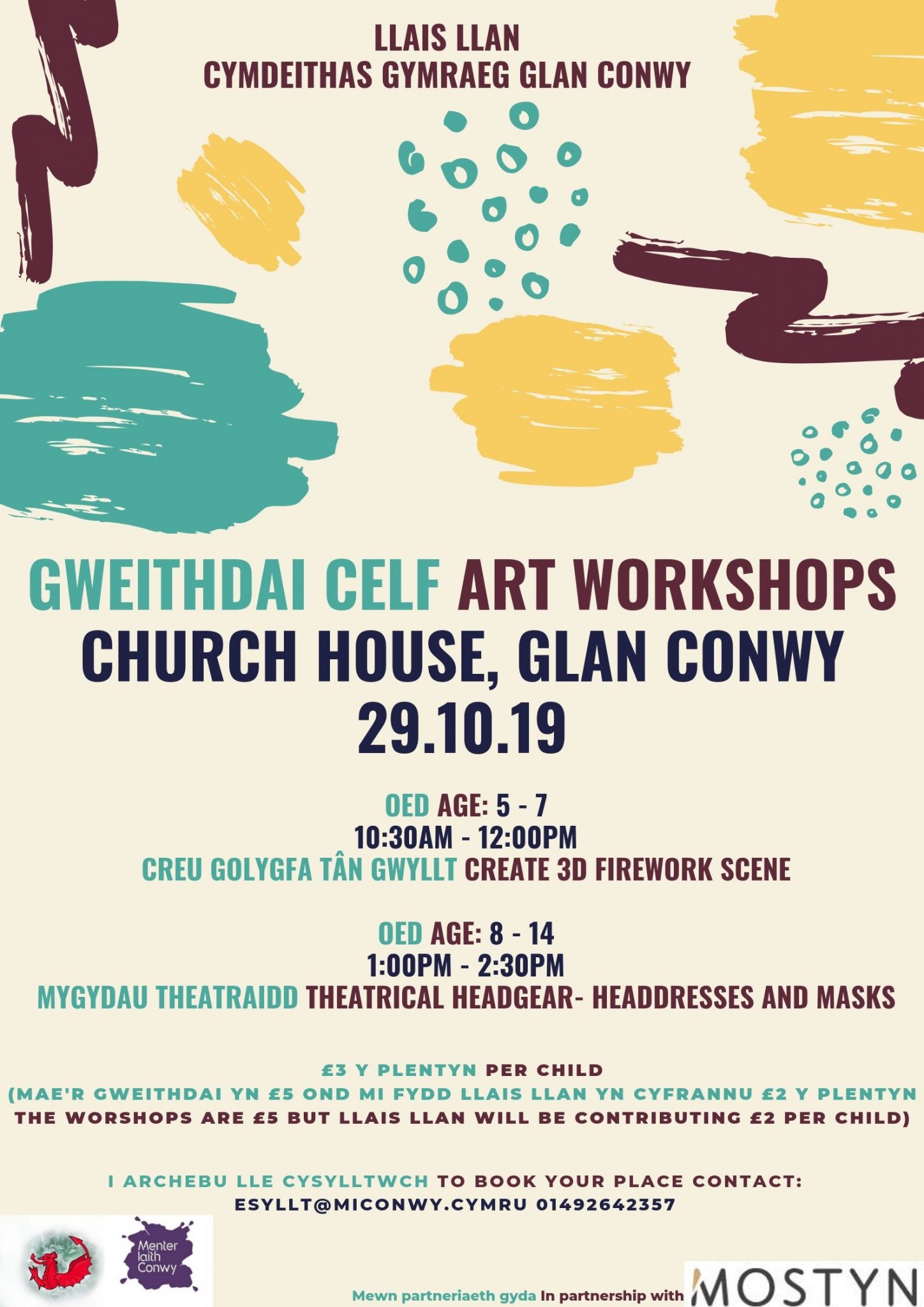 On the 29th of October, a great chance for children to participate in a arty workshop, organised by Llais Llan – Cymdeithas Gymraeg Glan Conwy as well as Mostyn. Workshops suitable for children between 5-14 years old – they will be creating a fireworks display or theatrical masks.